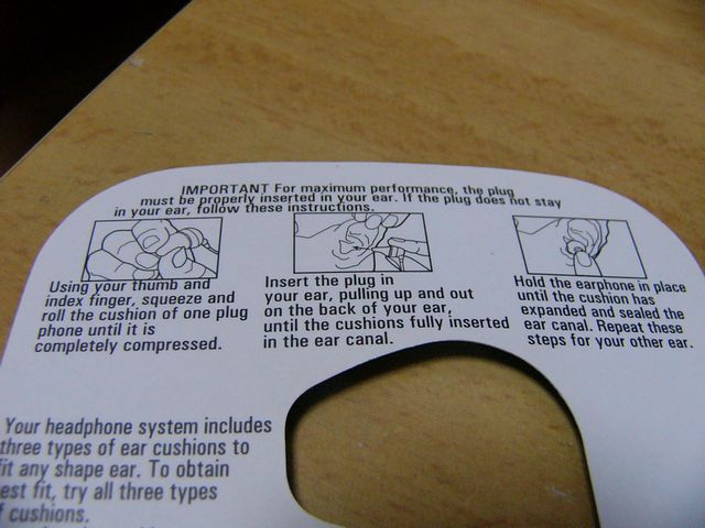 装着方法図解。イヤーピースはスポンジのようになっていて、ギュッと絞って耳に入れます。すると耳の中でふくらんでピッタリ!という方式。実際には、絞ってもすぐ元に戻っちゃうので入れにくいです。長時間の装着もちょっとイヤな感じ。